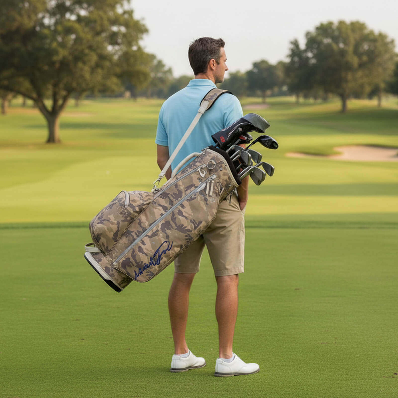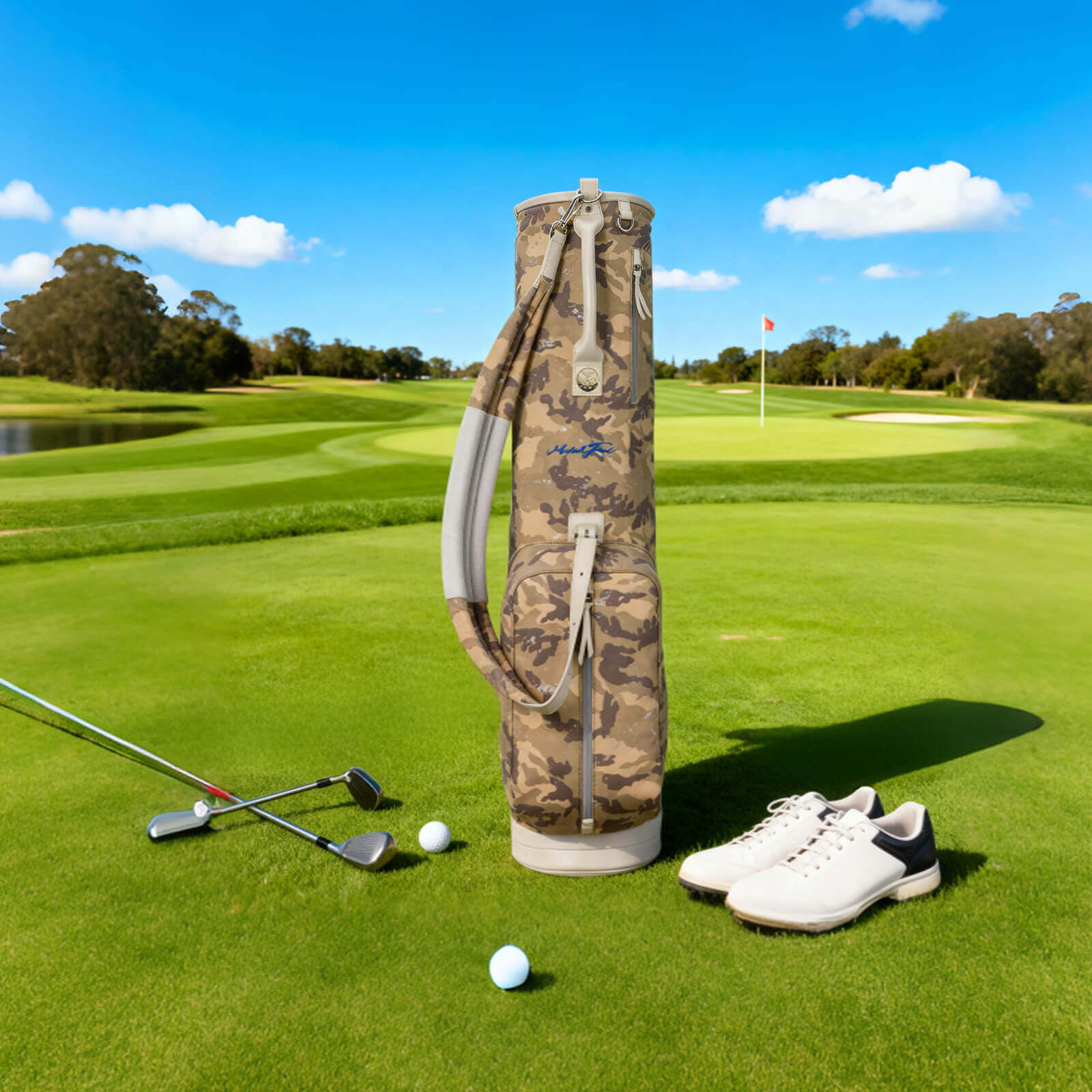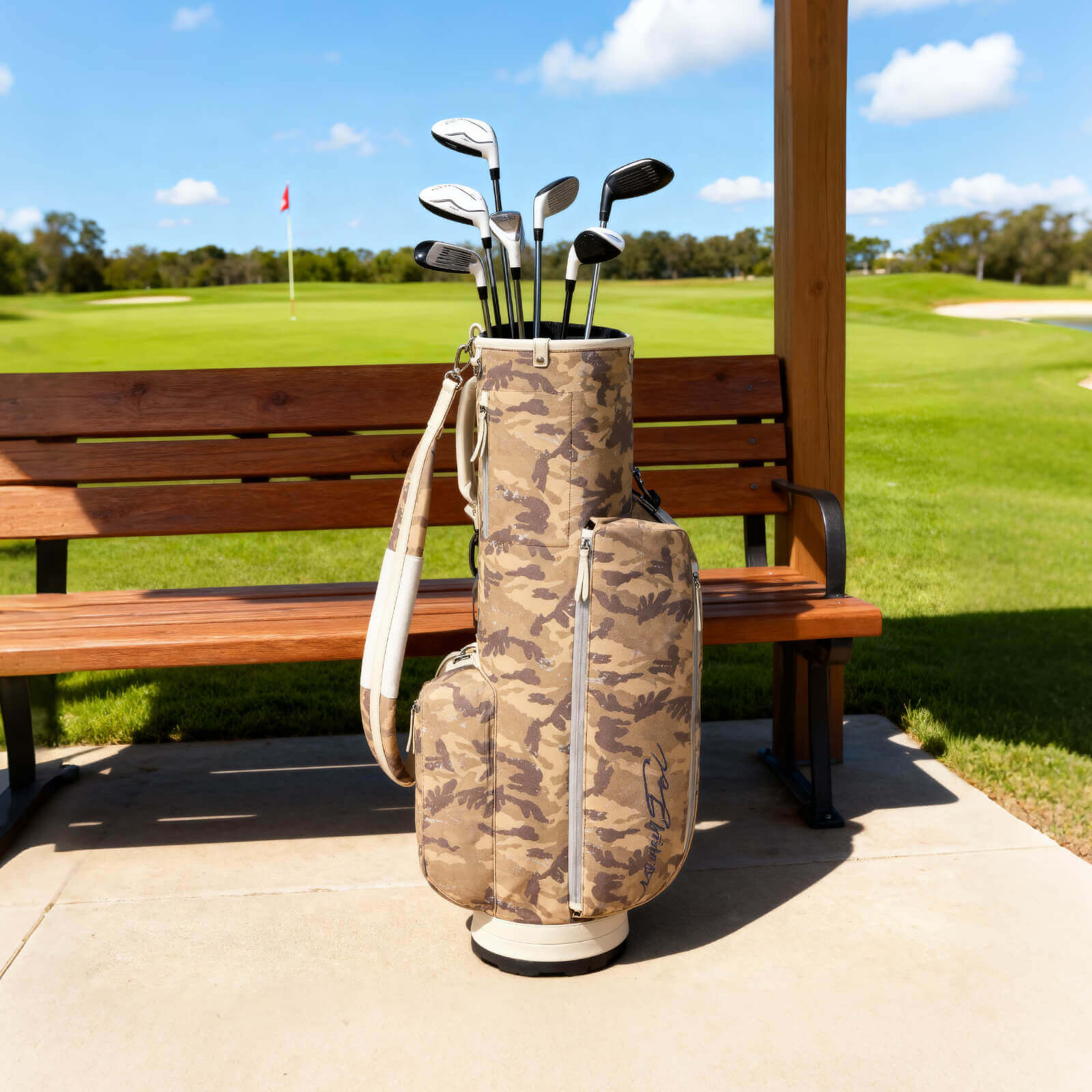 This camouflage canvas golf bag, blending durable canvas with premium leather accents, is both stylish and functional. The camouflage pattern adds a unique, adventurous touch, making it stand out on the golf course.