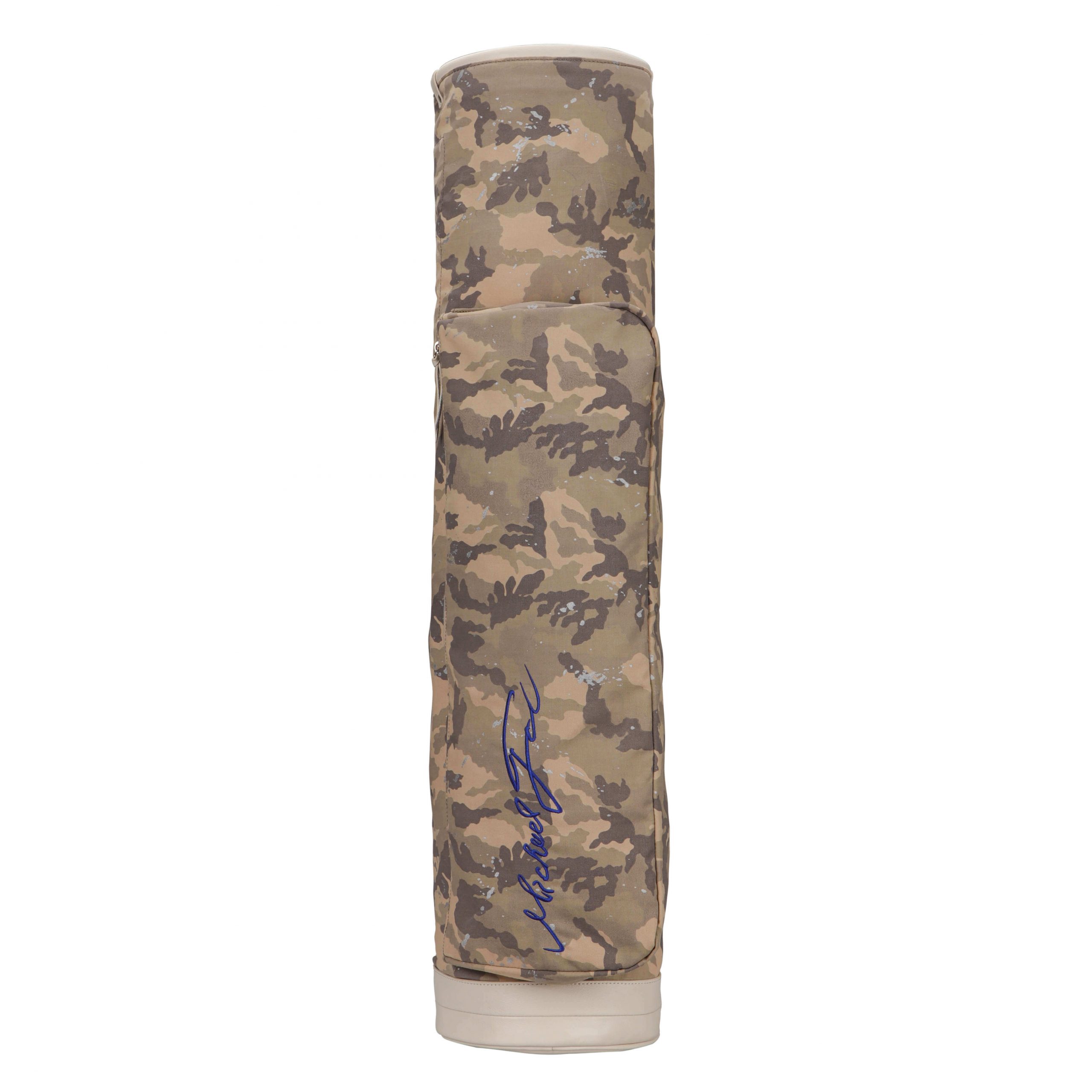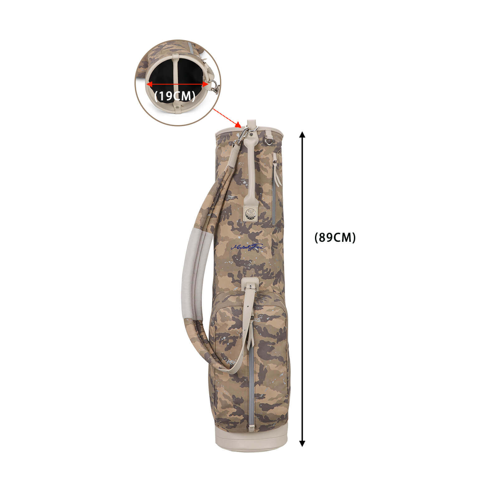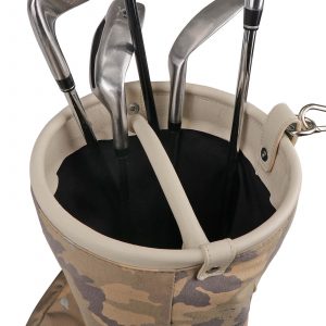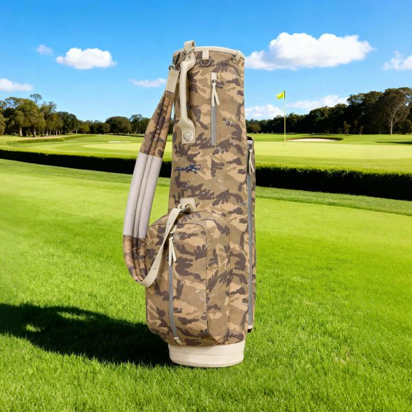 This camouflage canvas golf bag, blending durable canvas with premium leather accents, is both stylish and functional. The camouflage pattern adds a unique, adventurous touch, making it stand out on the golf course.